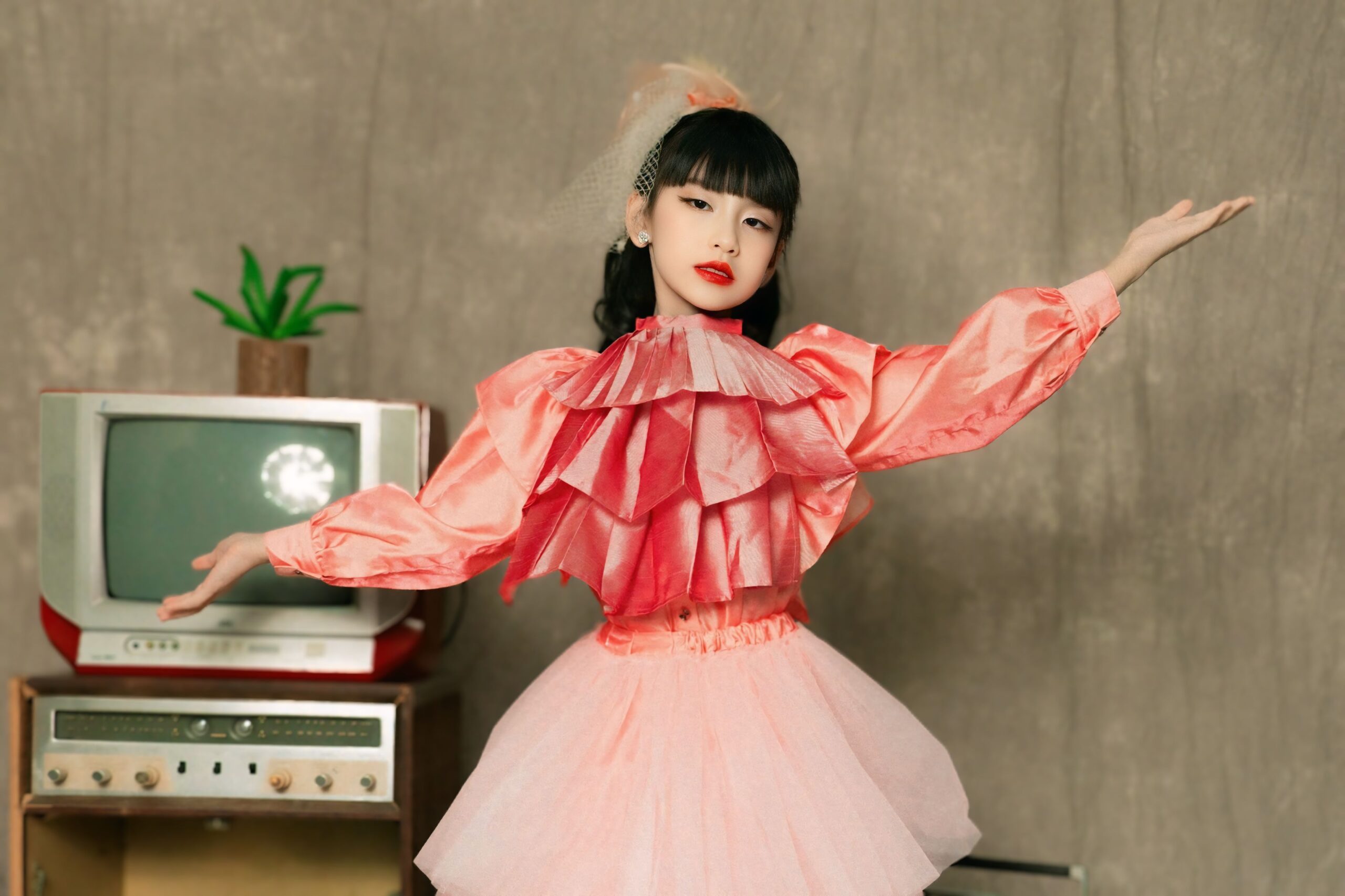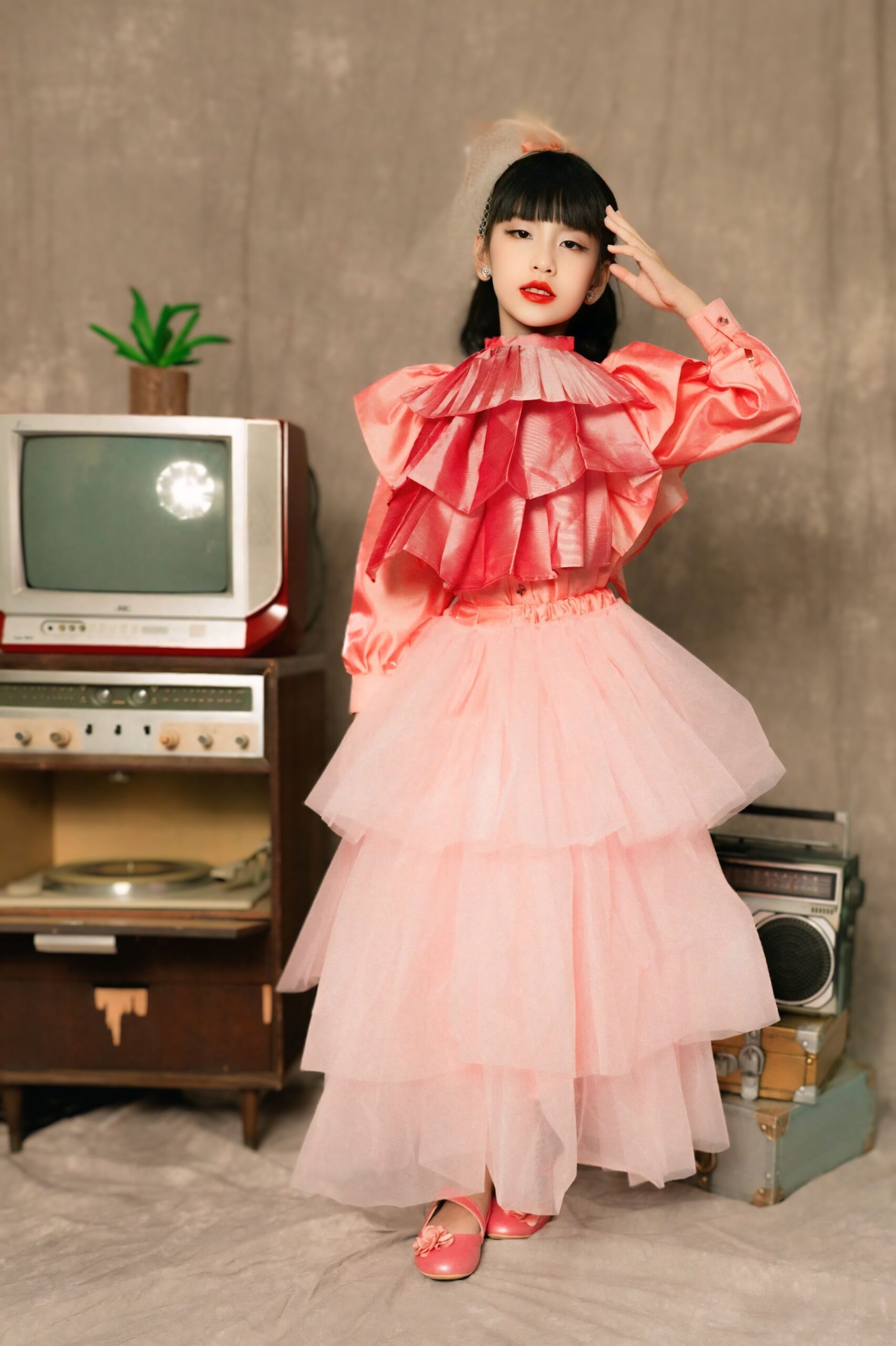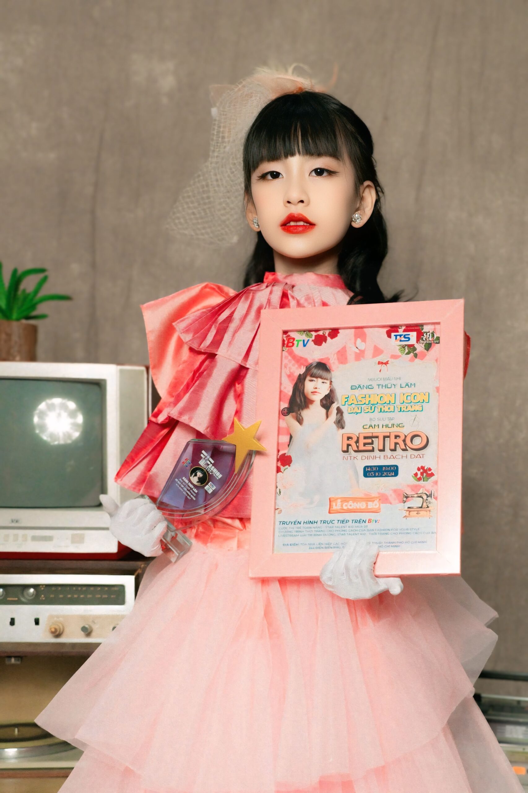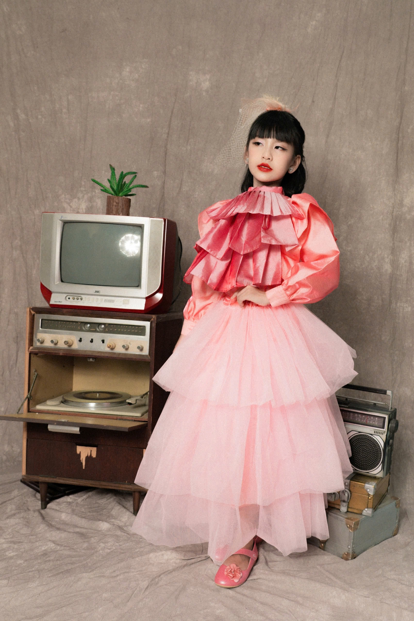 Sự kết hợp giữa vẻ đẹp ngây thơ, trong sáng của một người mẫu nhí và phong cách retro đầy màu sắc, đã tạo nên một hình ảnh mới mẻ và độc đáo.