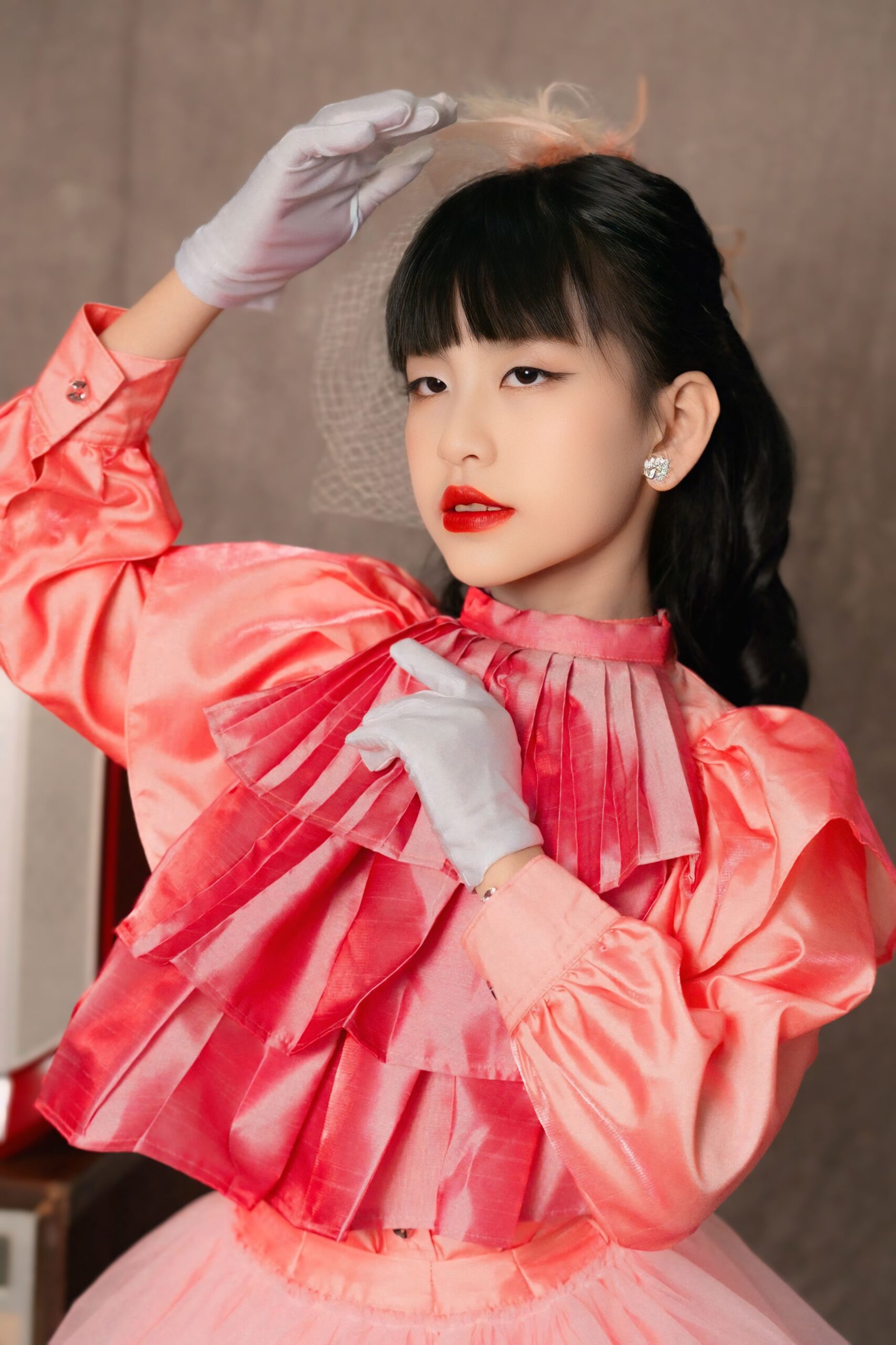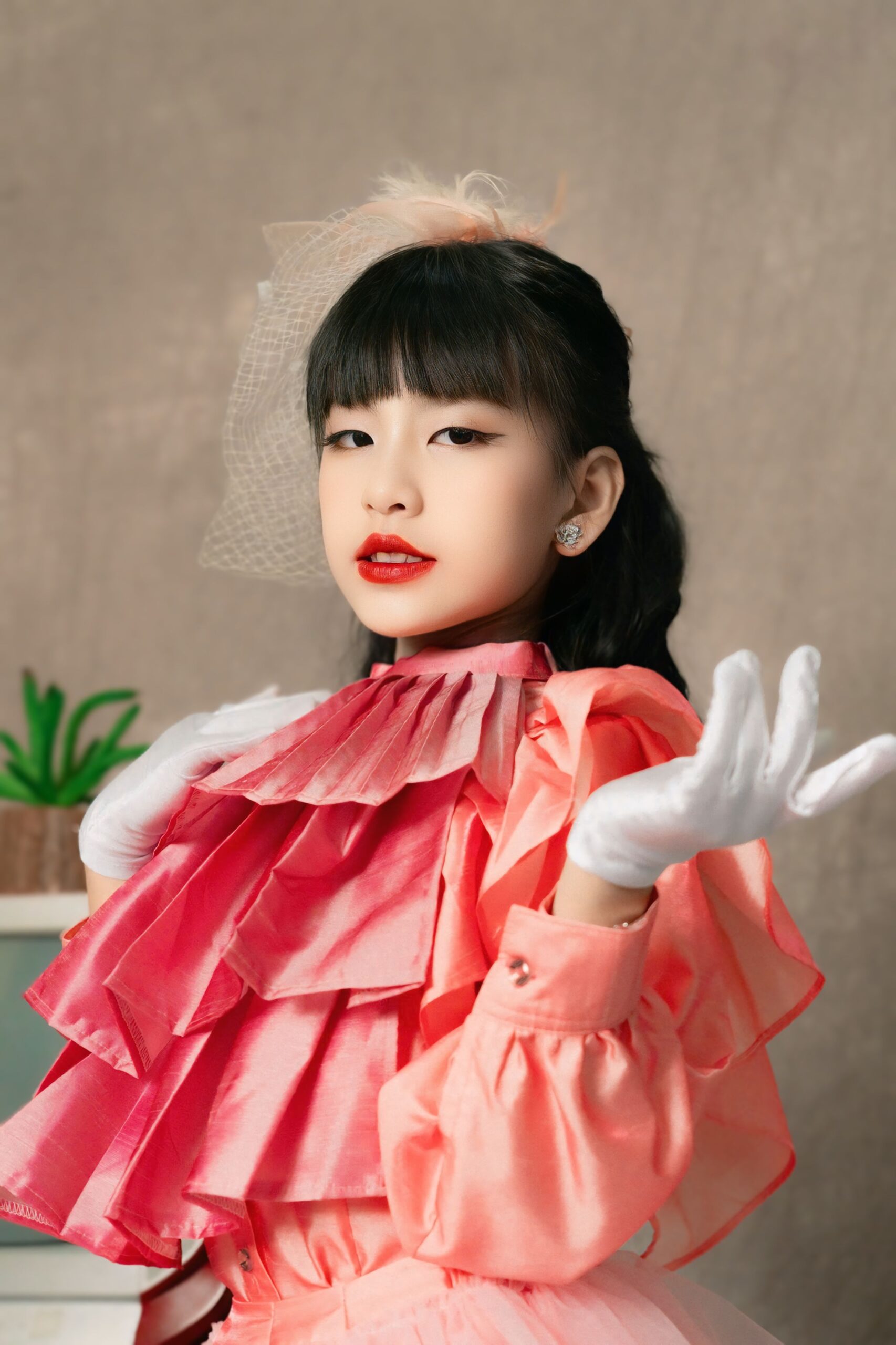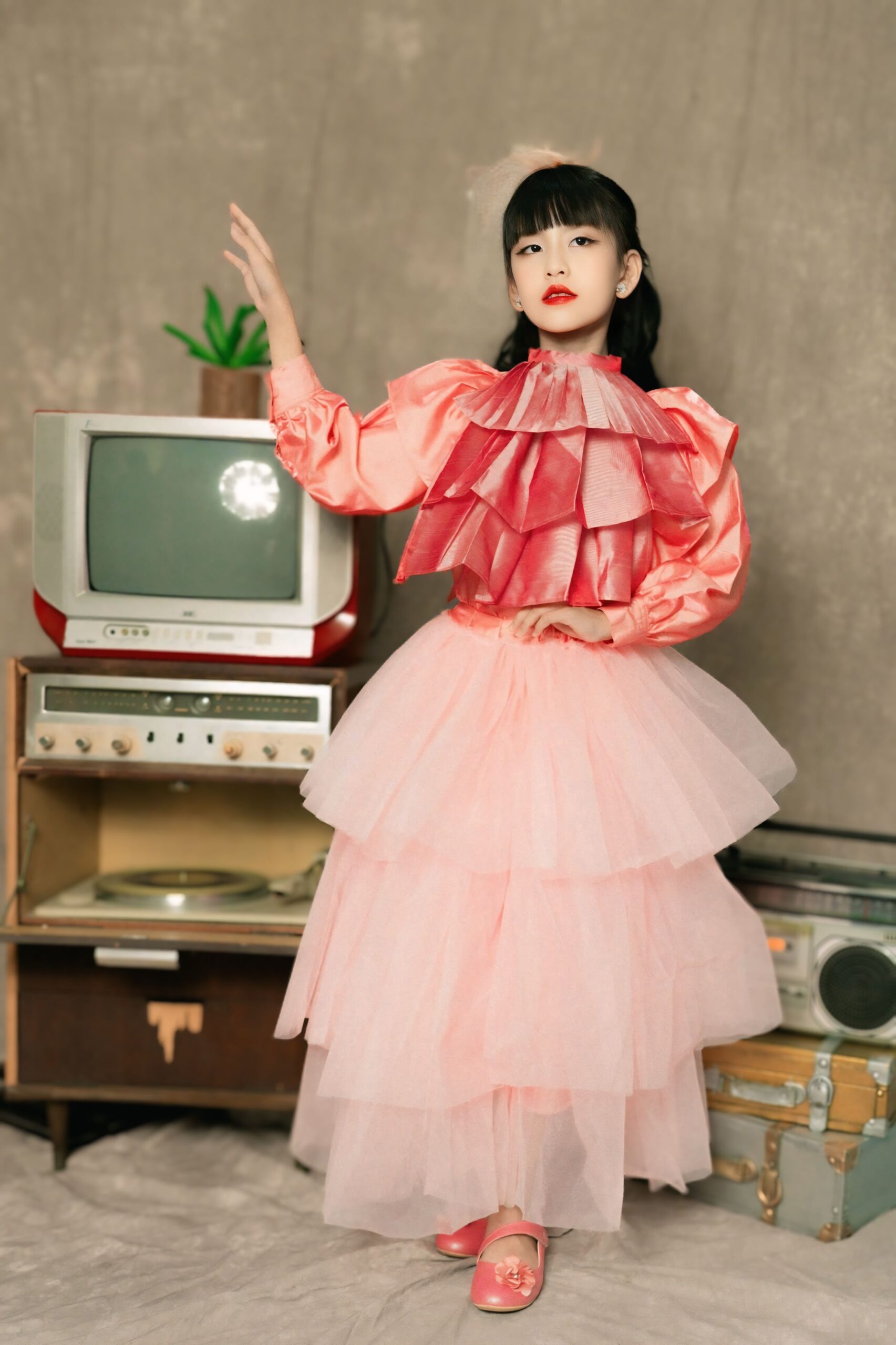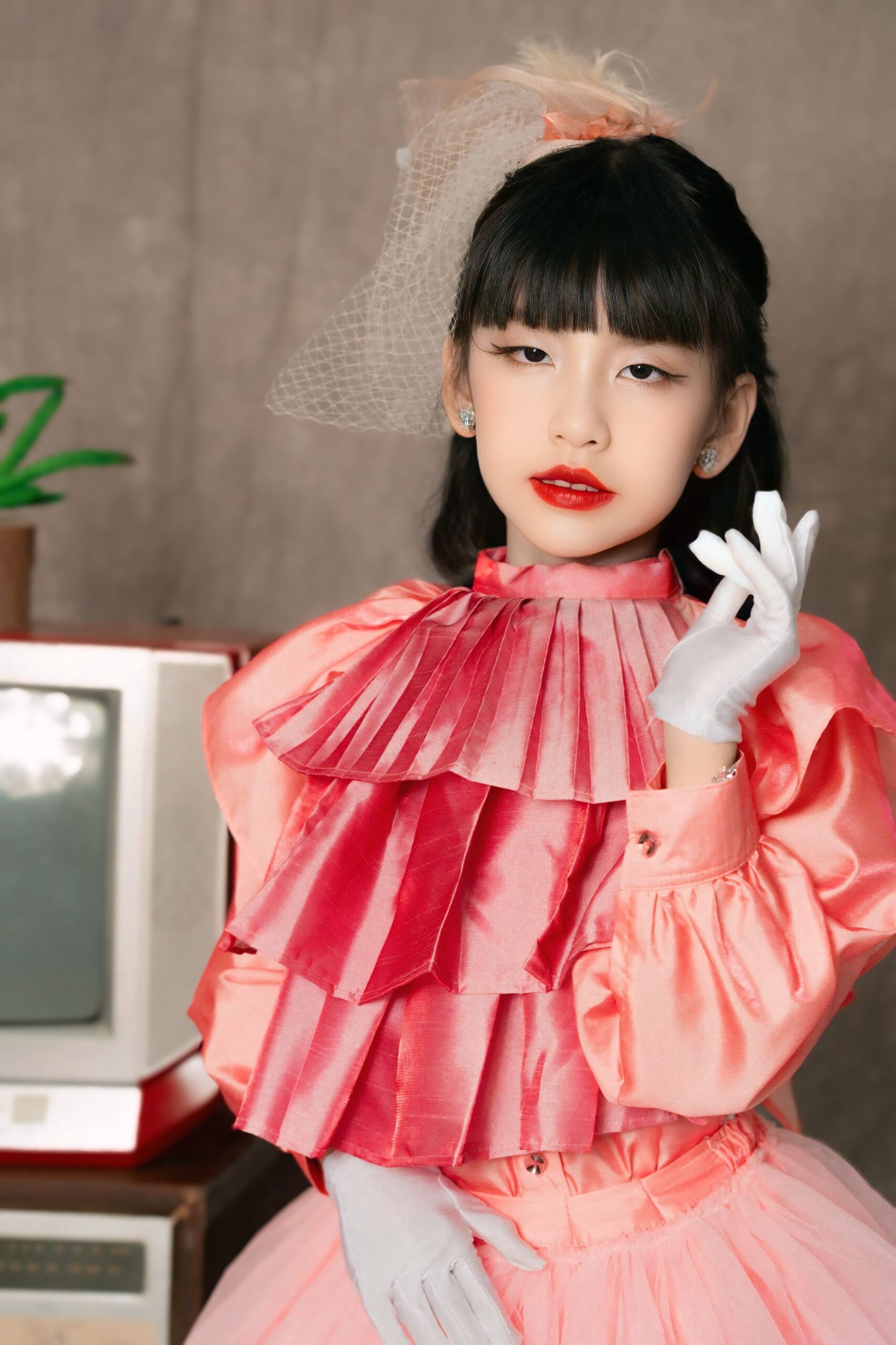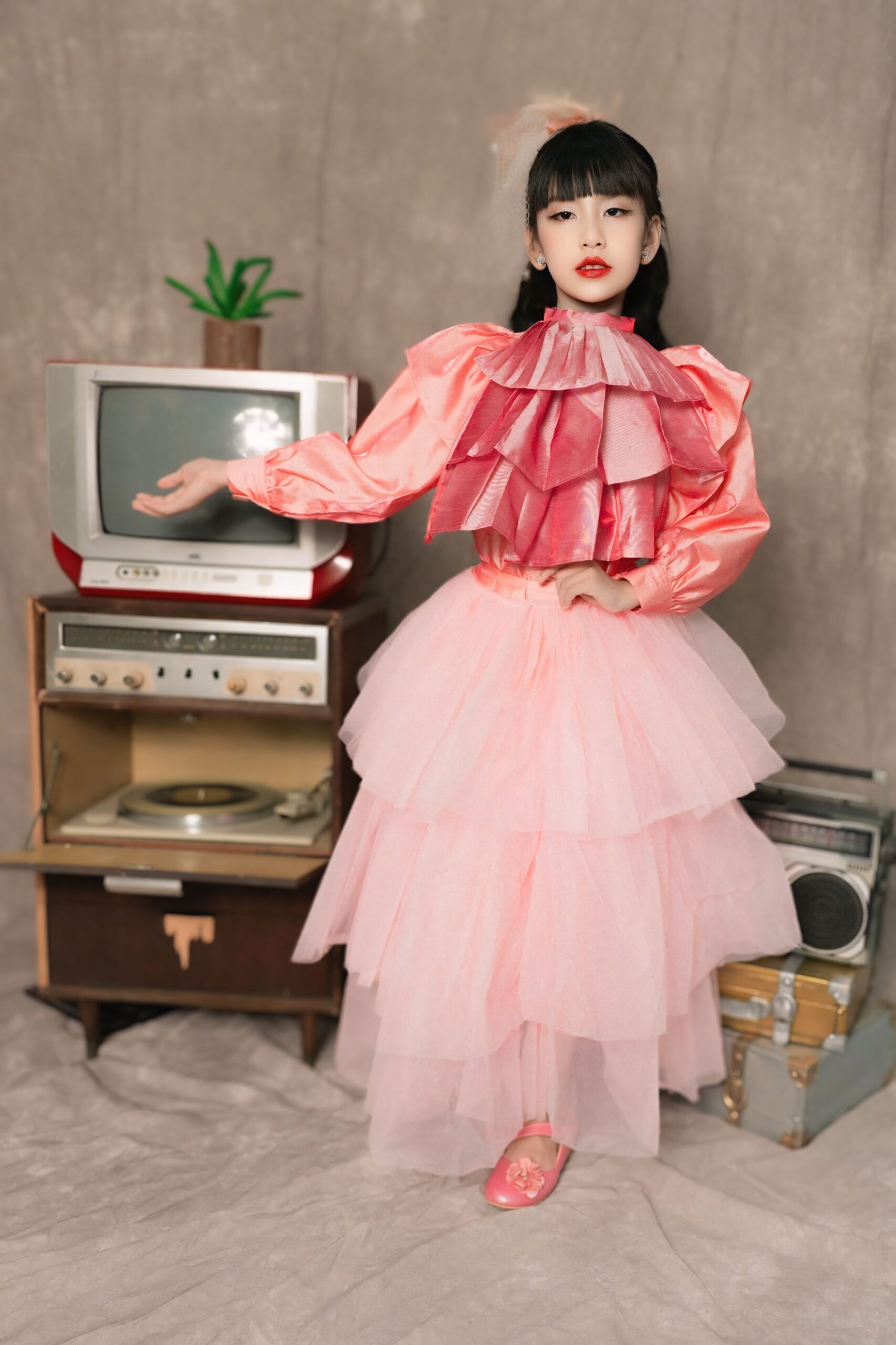Sự kết hợp giữa vẻ đẹp ngây thơ, trong sáng của một người mẫu nhí và phong cách retro đầy màu sắc, đã tạo nên một hình ảnh mới mẻ và độc đáo.