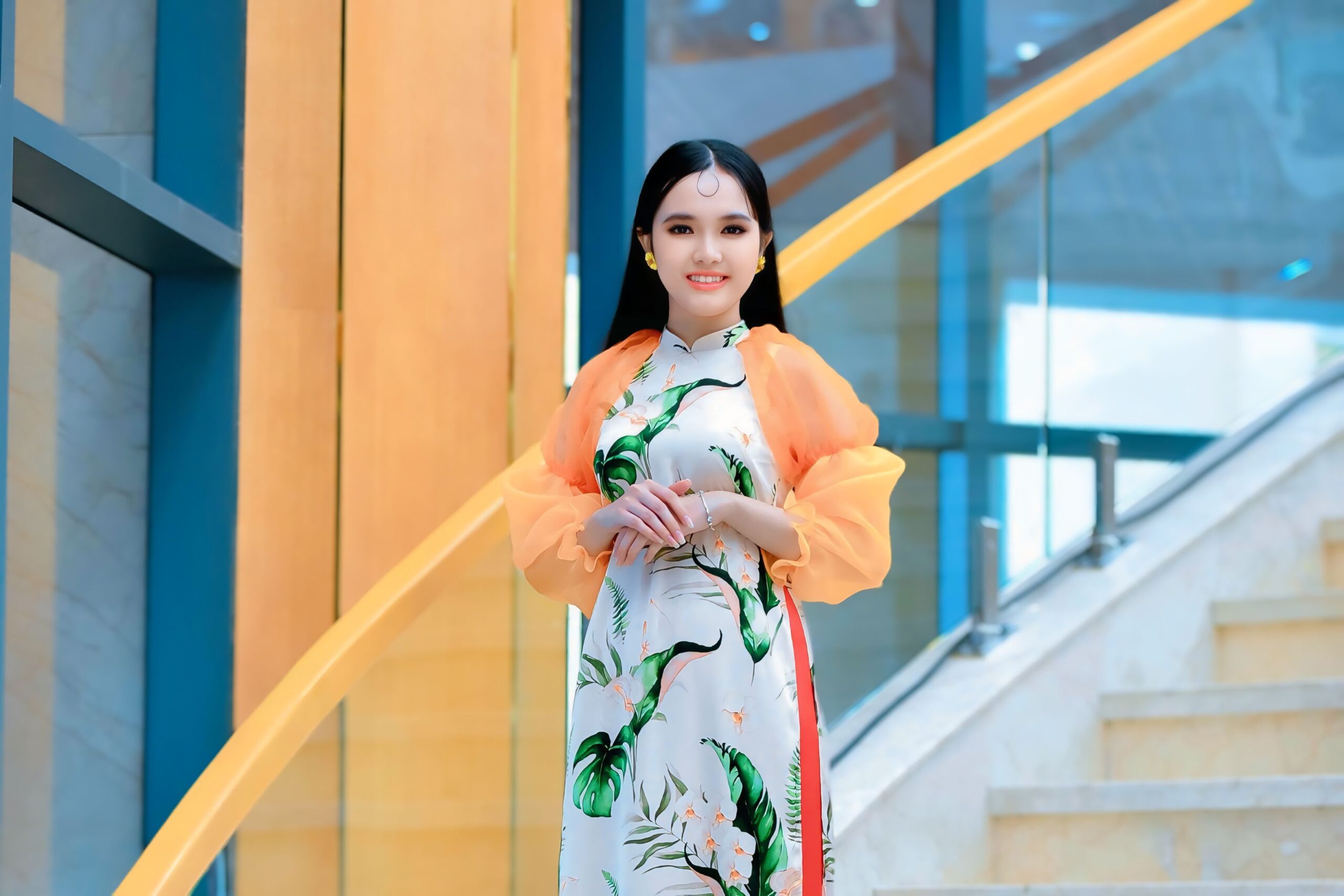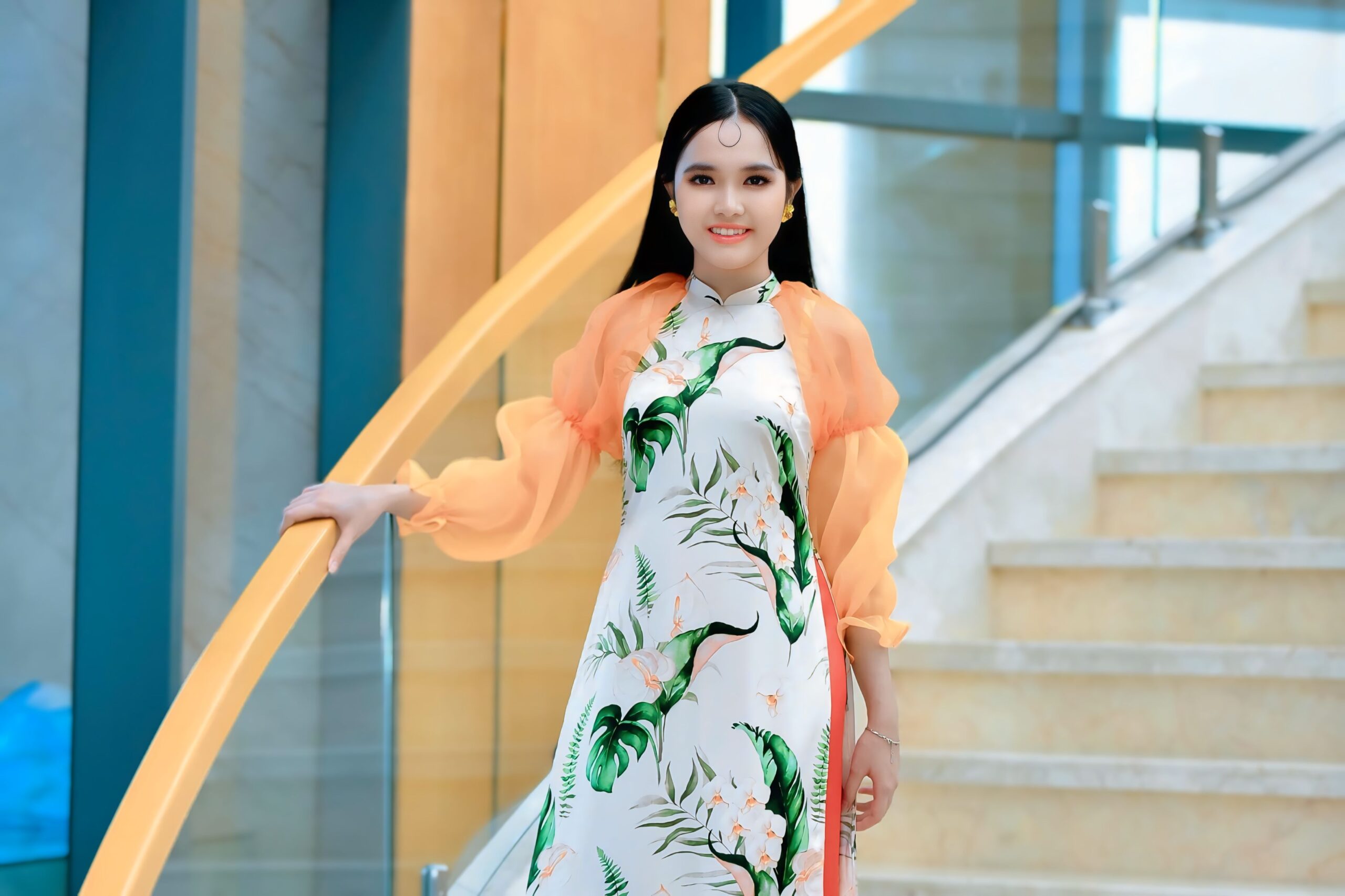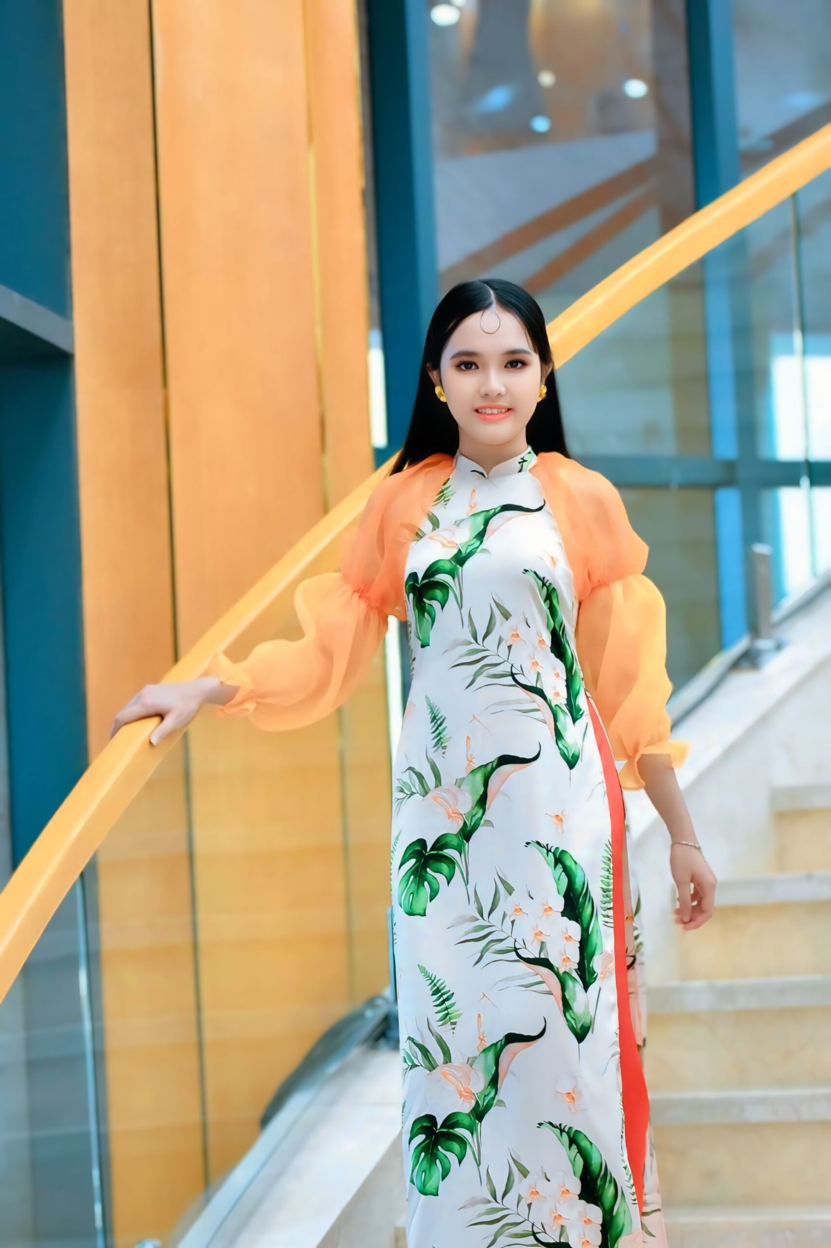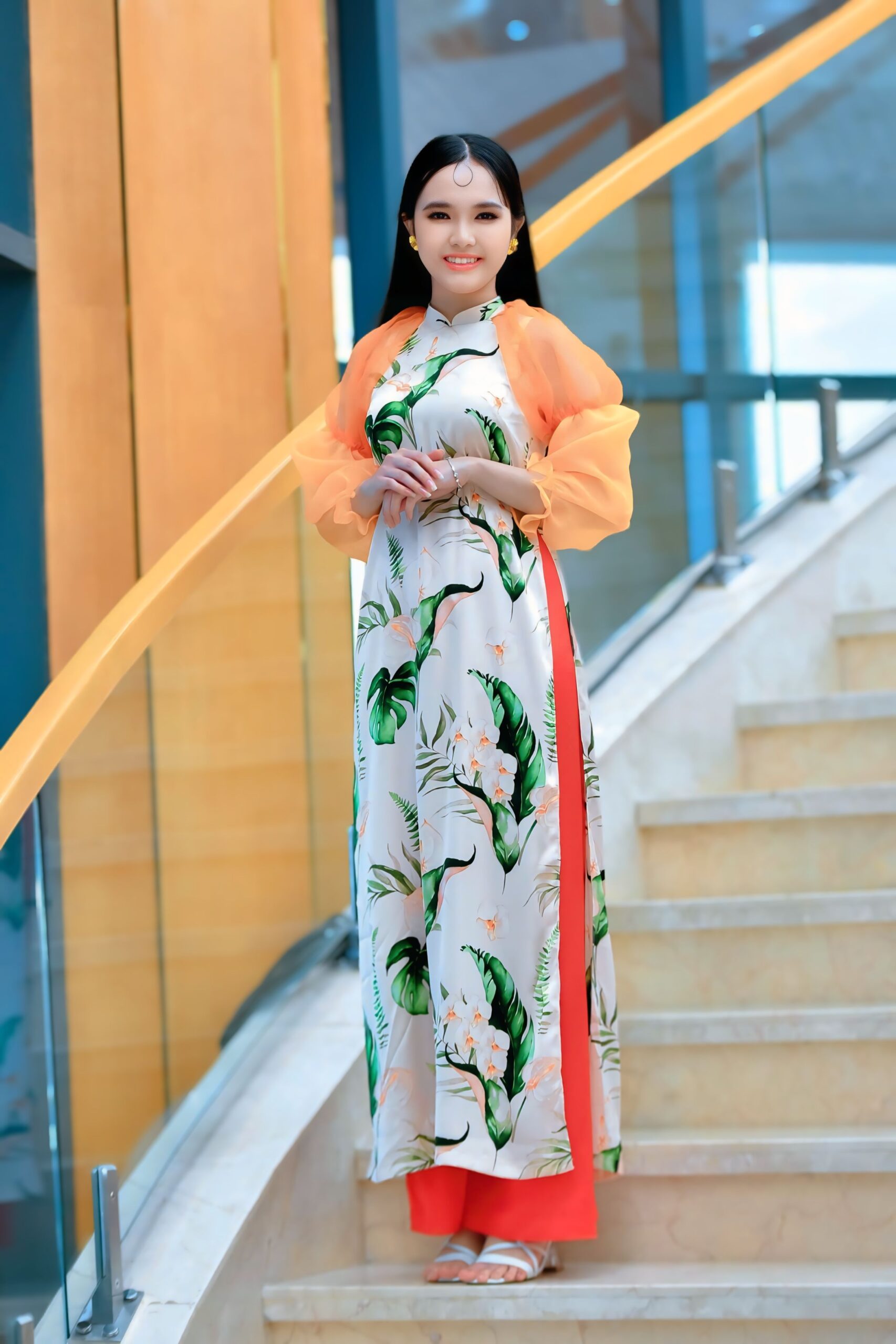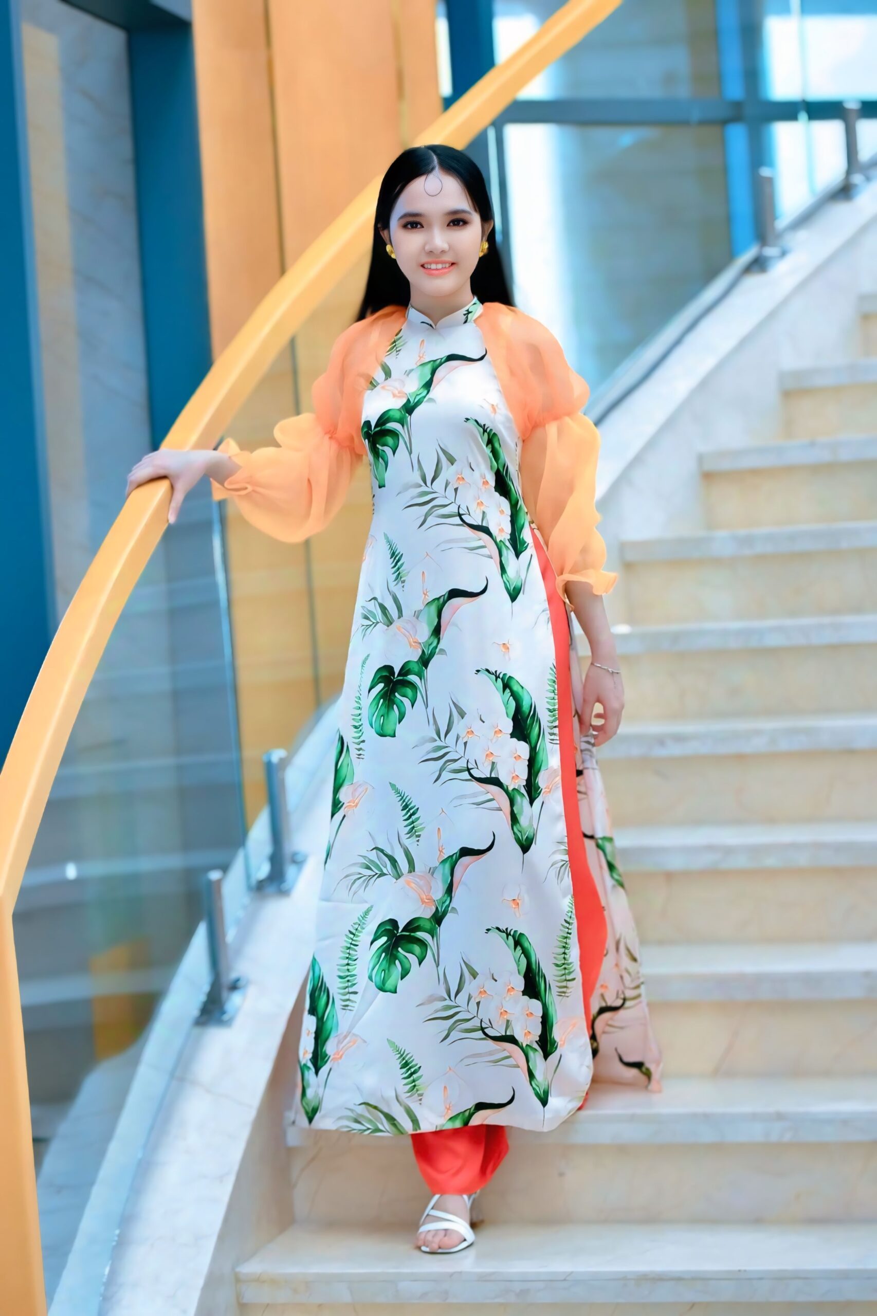 Nguyễn Mai Trang khoác lên mình trang phục áo dài trắng cam bắt mắt với họa tiết hoa lá xanh tươi tạo nên sự ăn khớp hài hòa của gam màu tươi tắn của bộ trang phục, hoàn thiện vẻ ngoài thanh lịch và đầy ấn tượng. Mái tóc được tạo kiểu tinh tế và lớp trang điểm nhẹ nhàng cũng góp phần làm nổi bật nét đẹp rạng rỡ của cô.