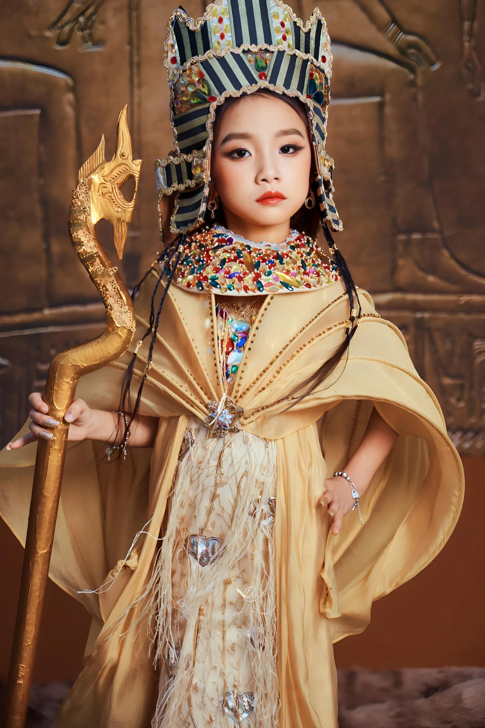 Trong không gian hoành tráng và đầy ma mị của Fashion Show Dấu Ấn Hoàng Gia, Dương Ngọc Tuệ Cát đã hoàn toàn chiếm lĩnh sân khấu ngay từ giây phút đầu tiên. Mặc dù tuổi còn nhỏ, nhưng cô bé đã thể hiện được khí chất vương giả, mang đến một màn trình diễn đầy ấn tượng, khiến cả khán giả lẫn giới chuyên môn không thể rời mắt. Với thần thái lạnh lùng, quyền lực và bước đi đầy tự tin, Tuệ Cát tỏa sáng như một nữ hoàng Ai Cập thực thụ, mang đến cho người xem một trải nghiệm đầy cảm xúc và mê hoặc.