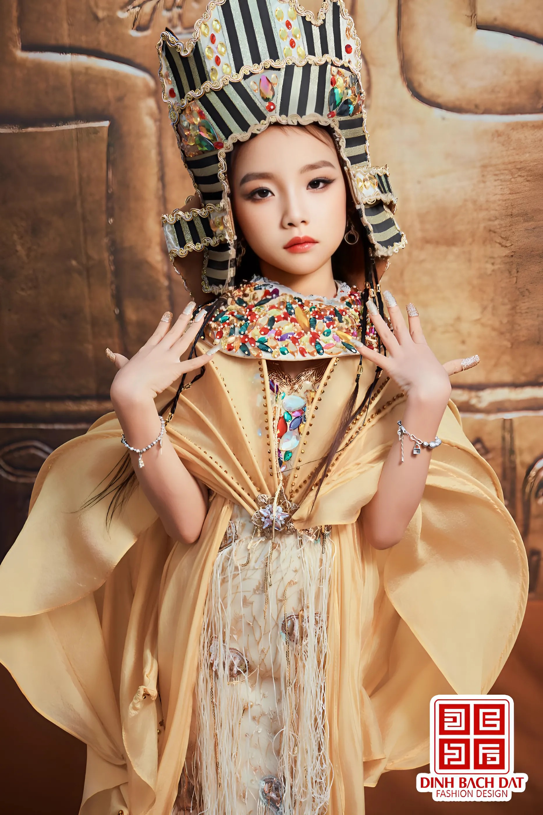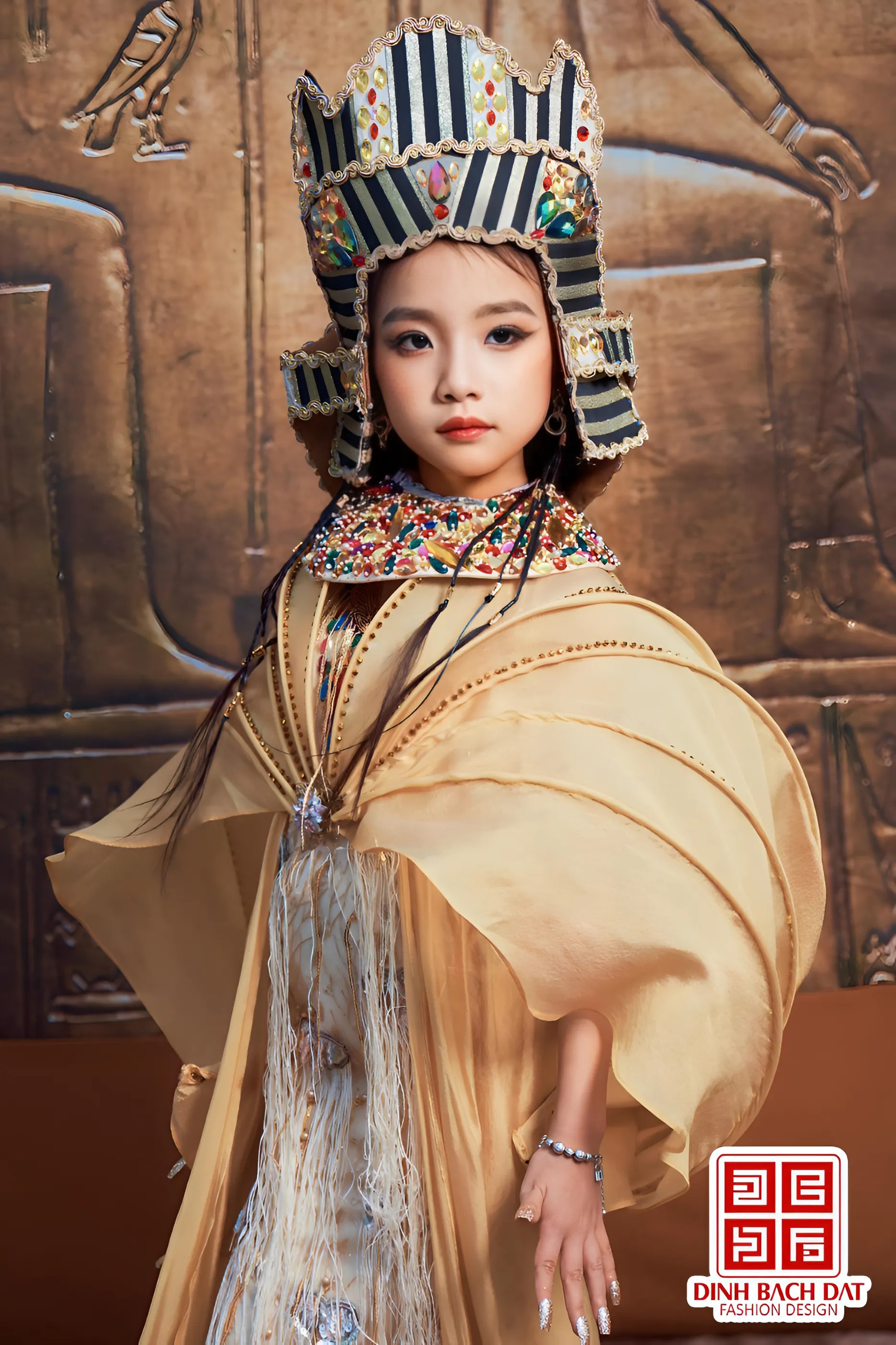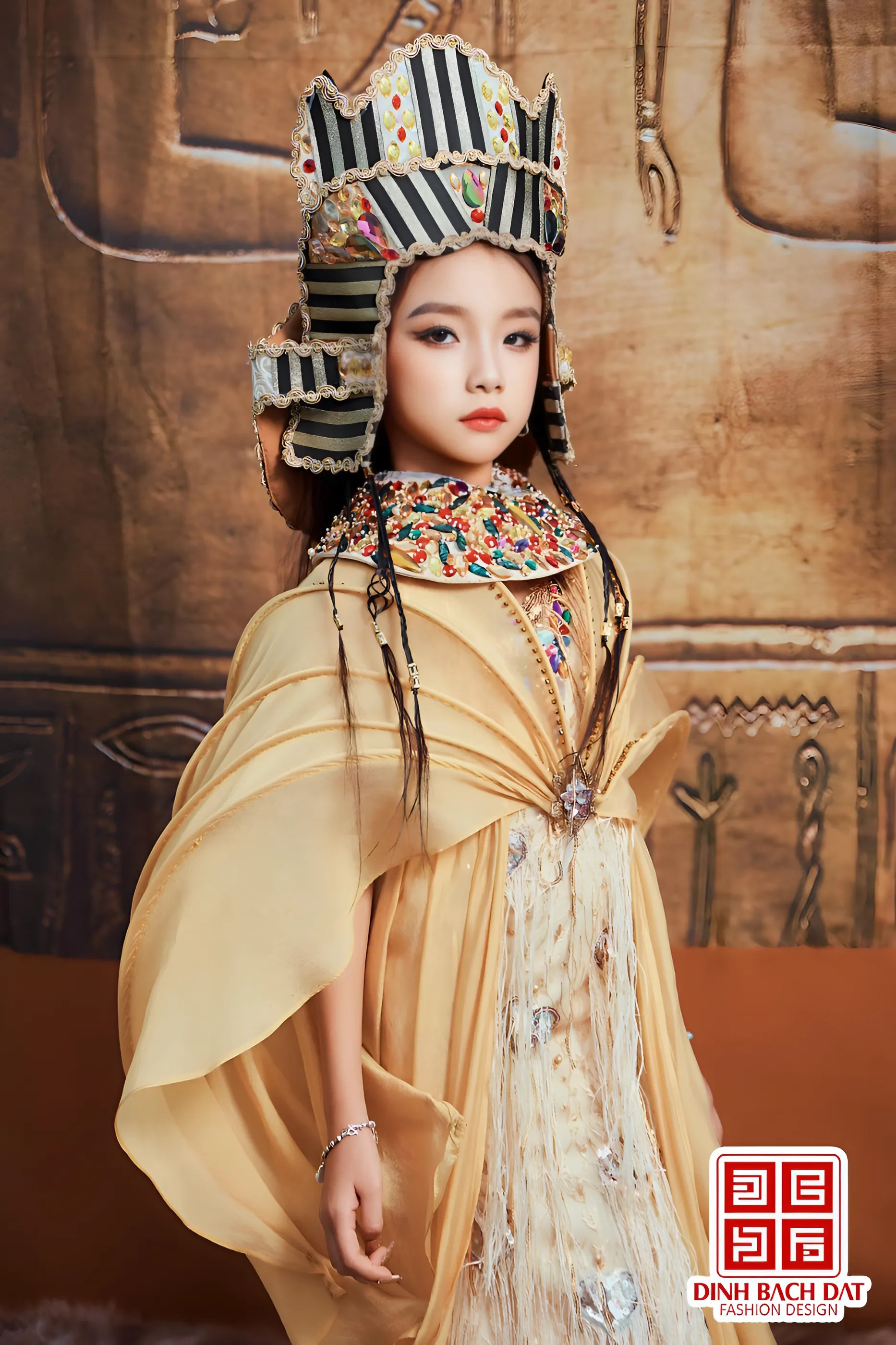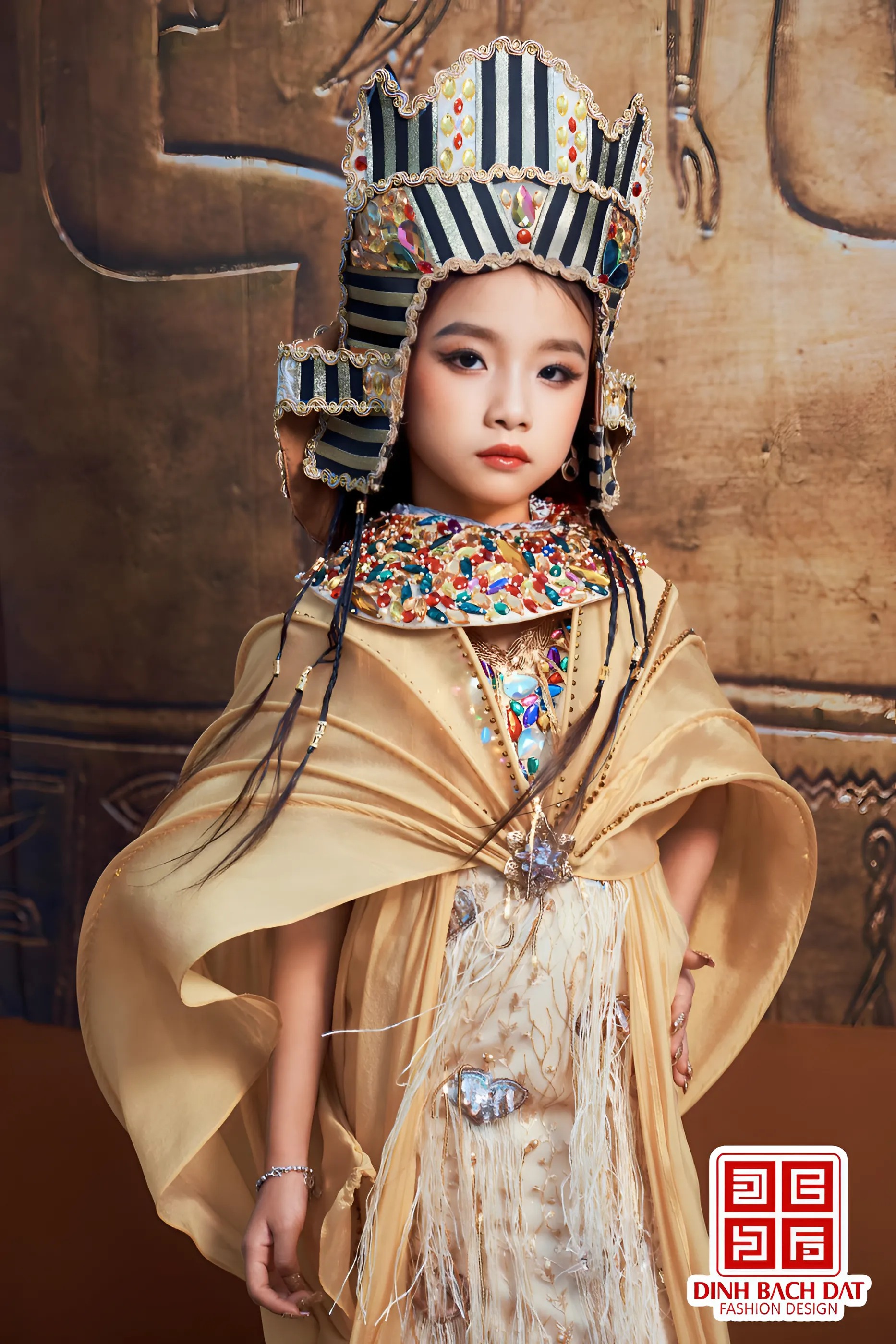 Trang phục vàng kim lấp lánh mà cô bé diện trong bộ sưu tập “Dấu Ấn Hoàng Gia” không chỉ là một thiết kế thời trang, mà còn là một tác phẩm nghệ thuật, giúp tôn vinh sự quyến rũ và uy quyền của một nữ vương cổ đại. Từng chi tiết được NTK Đinh Bách Đạt chăm chút kỹ lưỡng đã làm nổi bật vẻ đẹp quyền lực của Tuệ Cát. Cô bé không chỉ là người mẫu, mà còn là biểu tượng của sự kiêu hãnh và mạnh mẽ, khiến khán giả không thể không thán phục trước mỗi bước đi tựa như lời tuyên ngôn về sự thống trị và quyền lực.