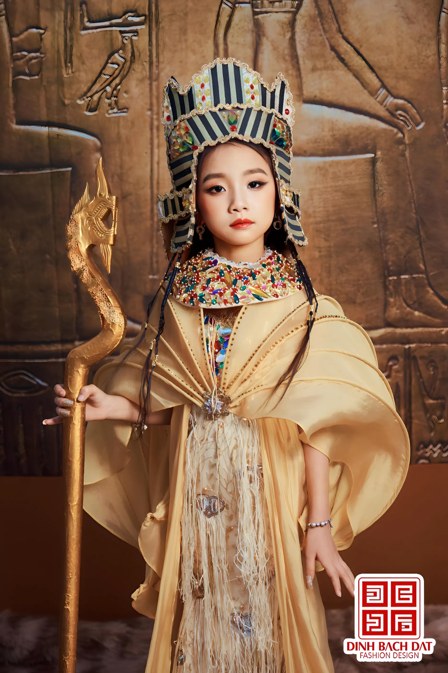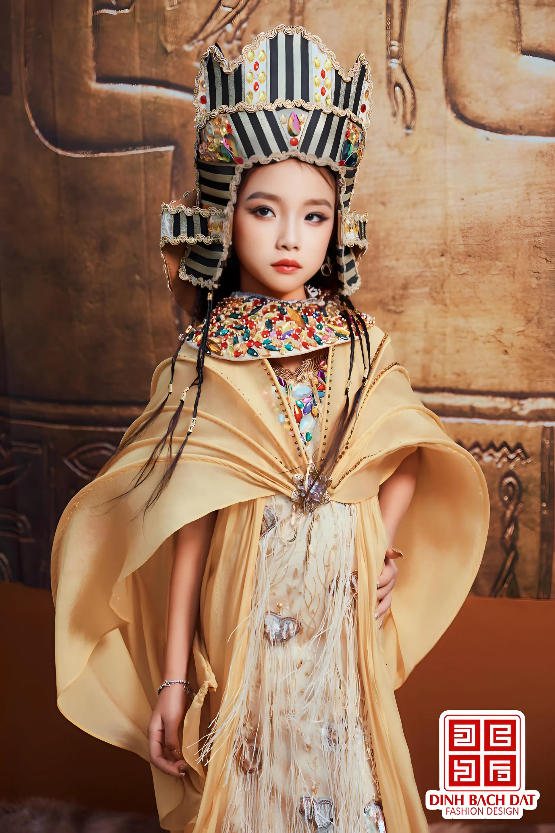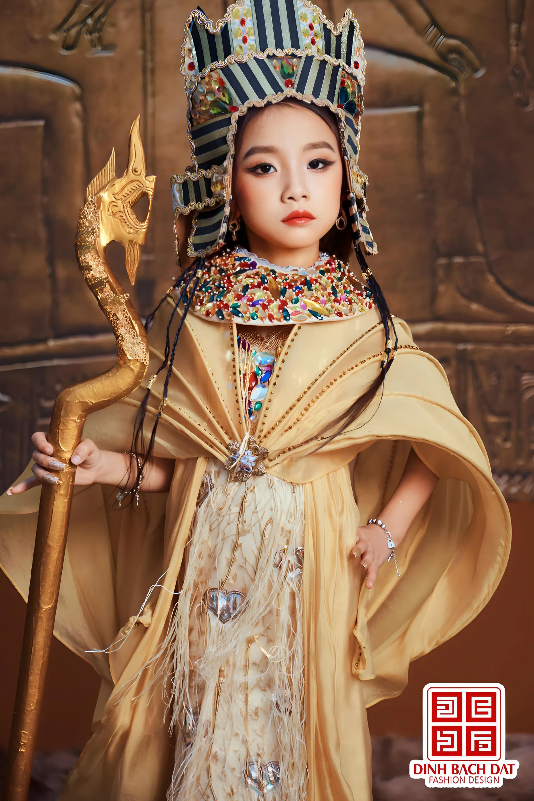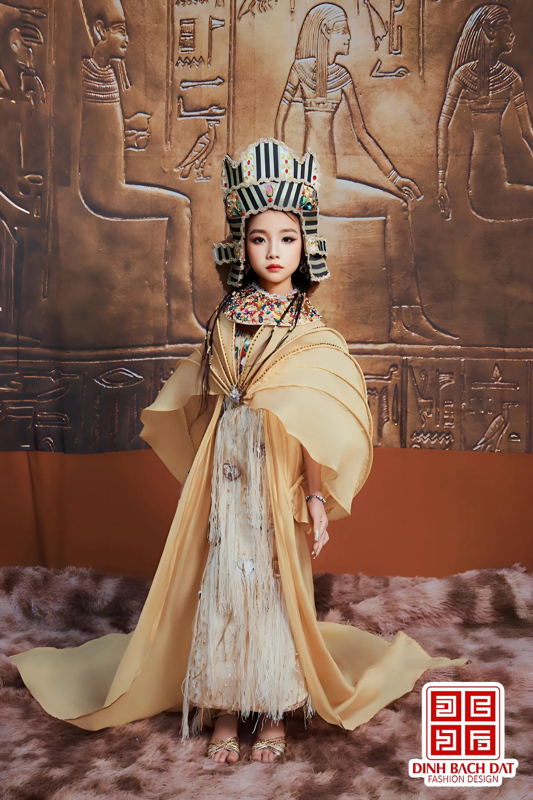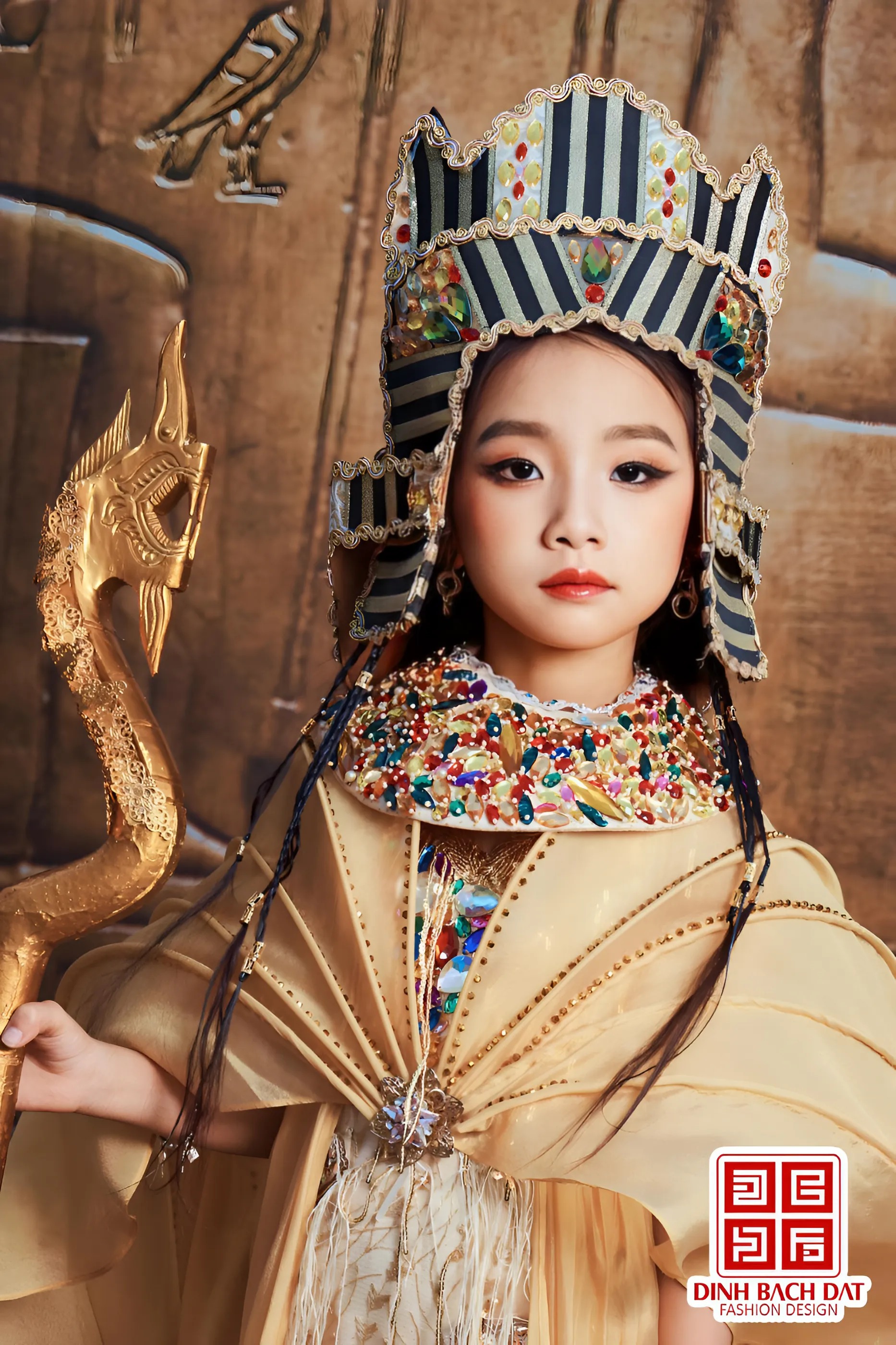 Trang phục vàng kim lấp lánh mà cô bé diện trong bộ sưu tập “Dấu Ấn Hoàng Gia” không chỉ là một thiết kế thời trang, mà còn là một tác phẩm nghệ thuật, giúp tôn vinh sự quyến rũ và uy quyền của một nữ vương cổ đại. Từng chi tiết được NTK Đinh Bách Đạt chăm chút kỹ lưỡng đã làm nổi bật vẻ đẹp quyền lực của Tuệ Cát. Cô bé không chỉ là người mẫu, mà còn là biểu tượng của sự kiêu hãnh và mạnh mẽ, khiến khán giả không thể không thán phục trước mỗi bước đi tựa như lời tuyên ngôn về sự thống trị và quyền lực.