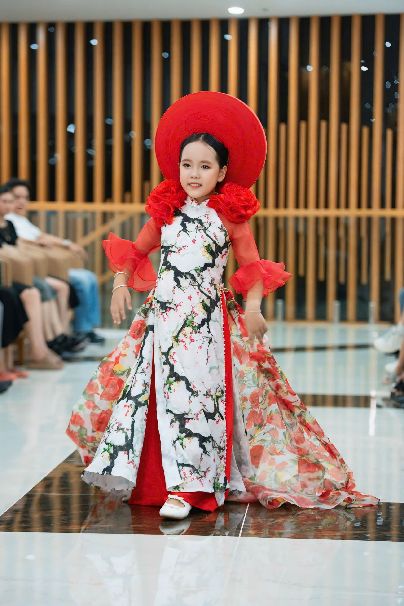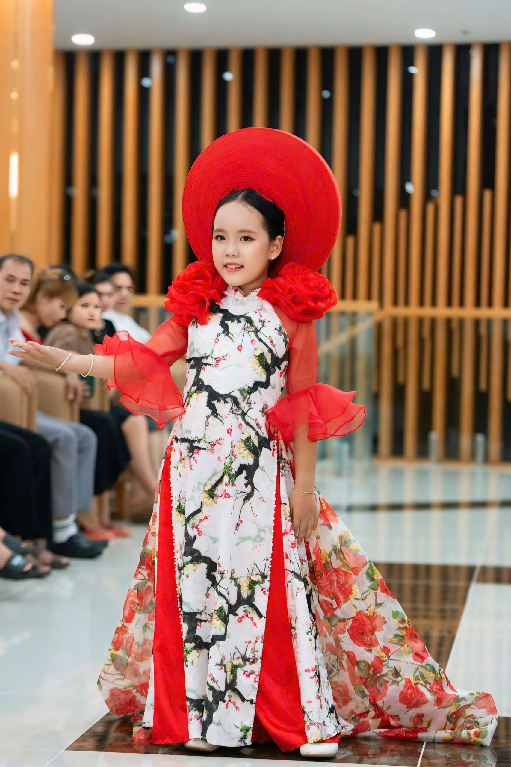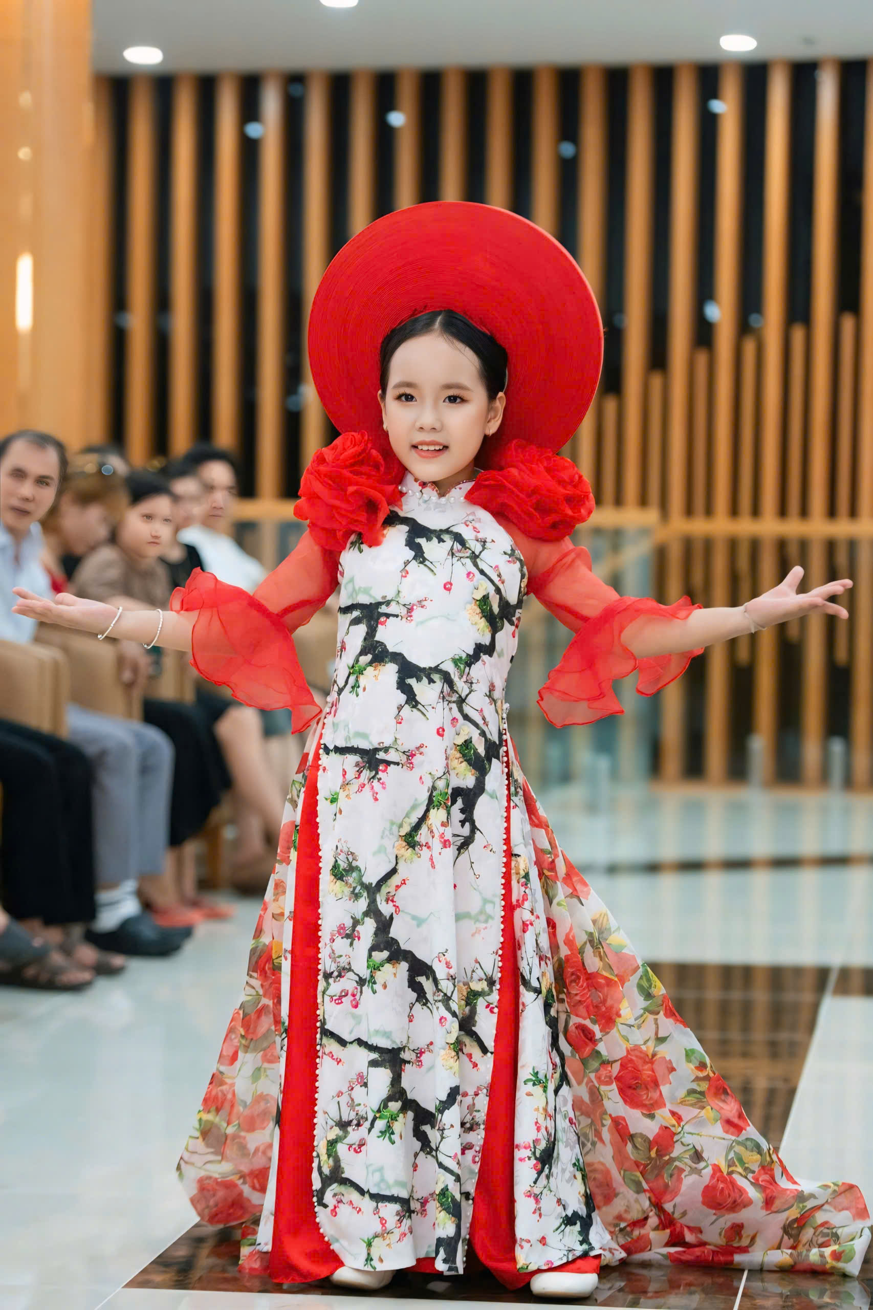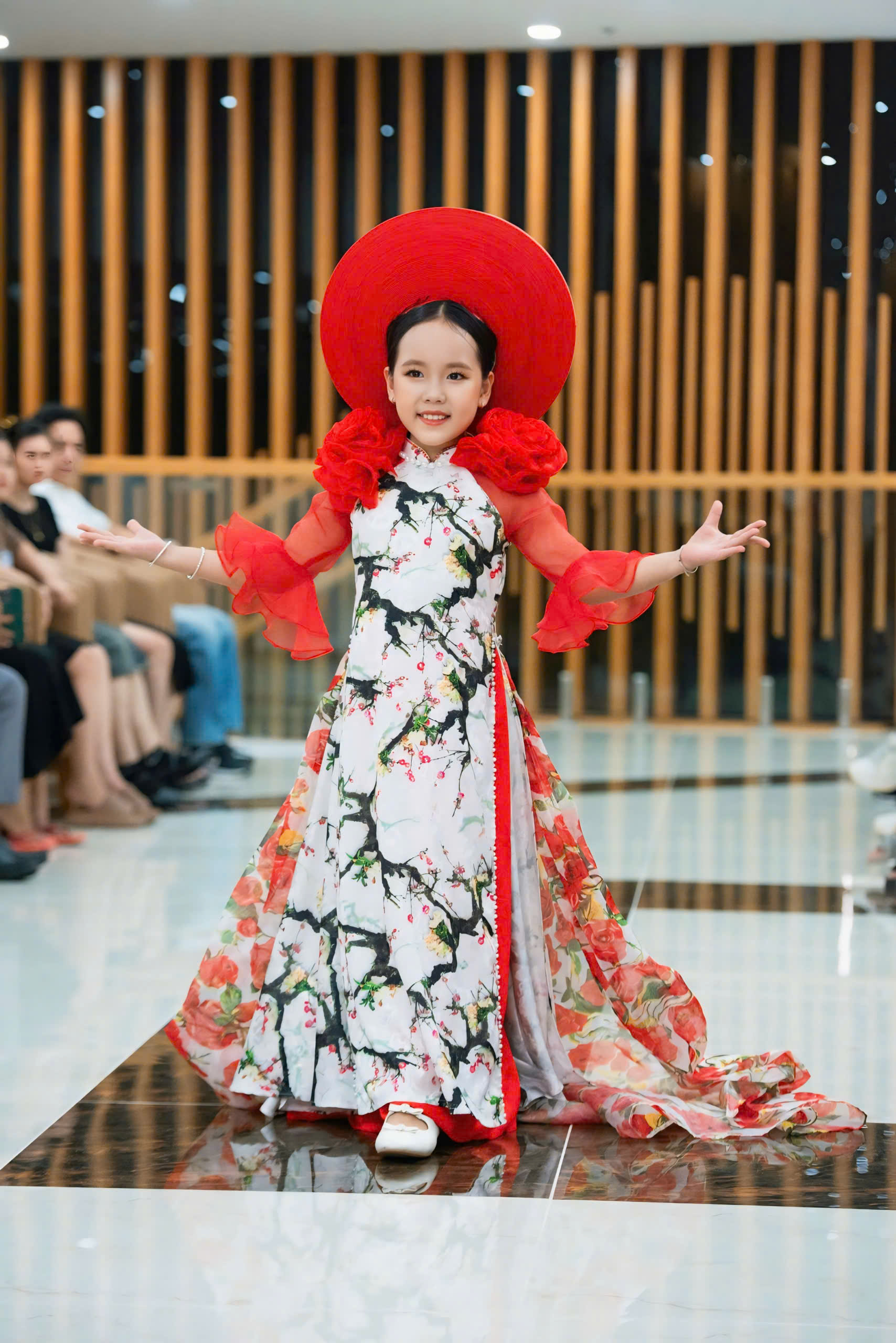 Sự kết hợp giữa vẻ đẹp truyền thống của áo dài và sự sáng tạo không ngừng của NTK Đinh Bách Đạt đã tạo nên một tác phẩm thời trang đầy màu sắc và cuốn hút. Mẫu áo dài mà Gia Hân trình diễn được thiết kế với những đường nét mềm mại và họa tiết tinh xảo, thể hiện sự kết hợp hoàn hảo giữa truyền thống và hiện đại. Chất liệu vải cao cấp cùng gam màu sắc hài hòa đã giúp tôn lên vóc dáng và nét đẹp của mình. Vũ Thảo Gia Hân, với bước đi catwalk tự tin và phong thái đáng yêu, đã thực sự làm sống động những thiết kế này, mang đến một làn gió mới cho làng thời trang Việt Nam.