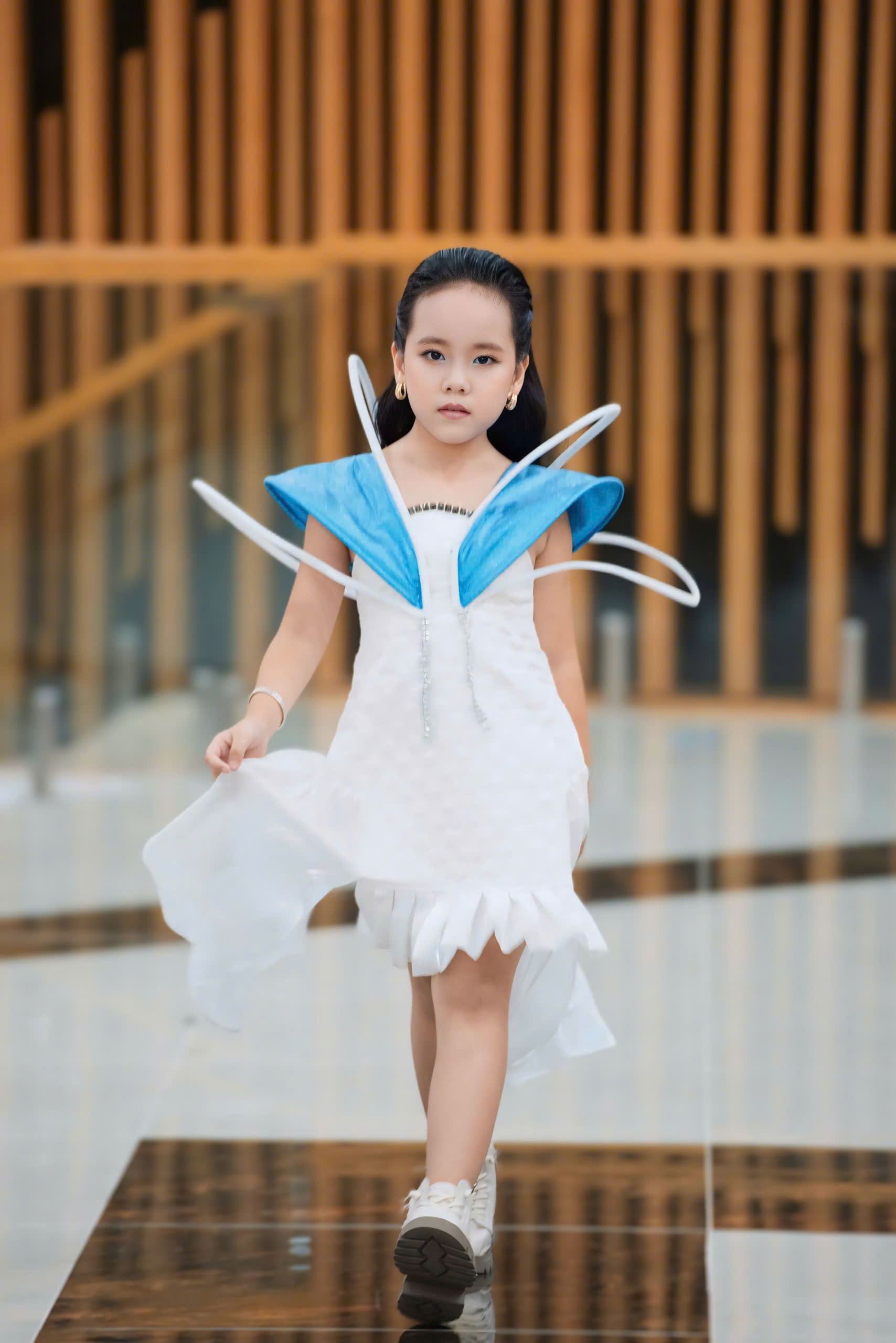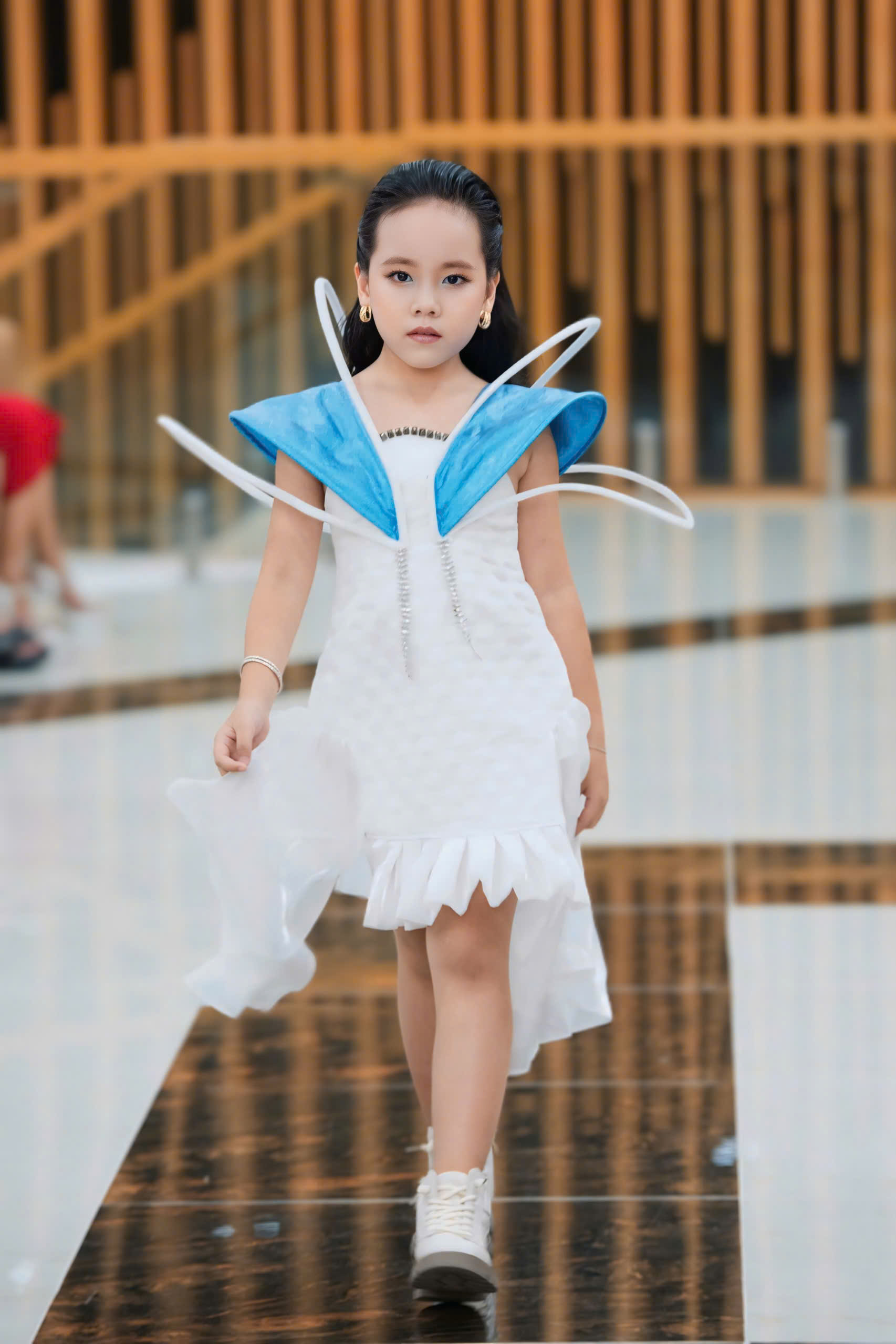 Mẫu váy mà Gia Hân mặc được thiết kế tinh tế, với những họa tiết sinh động. Chất liệu vải mềm mại, phối hợp hài hòa giữa các gam màu. Khi bước lên sàn catwalk, Gia Hân thể hiện sự tự tin và cuốn hút, mỗi bước đi đều mang đến một cảm giác nhẹ nhàng và uyển chuyển. Nụ cười rạng rỡ của cô đã khiến cho mẫu váy trở nên nổi bật hơn, thể hiện rõ nét sự vui tươi và năng lượng của tuổi trẻ. Gia Hân không chỉ trình diễn trang phục, mà còn lan tỏa niềm vui và sự lạc quan đến với khán giả.